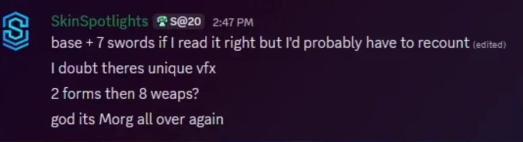 This remains unconfirmed. It is currently anticipated that the swords will share a unified VFX theme, but Riot may reveal differentiated animations as launch approaches.